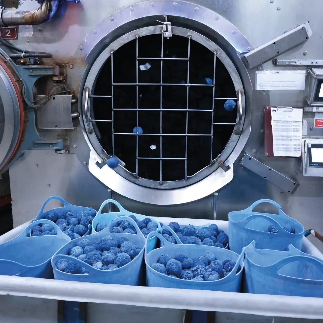 İki insan boyunda dev bir çamaşır makinesinde dönen mavi toplar ve onlarca jean. Kedi şahsiyetli ya da tekrar eden hareketlere düşkün biriyseniz baş döndürücü bir sahne.