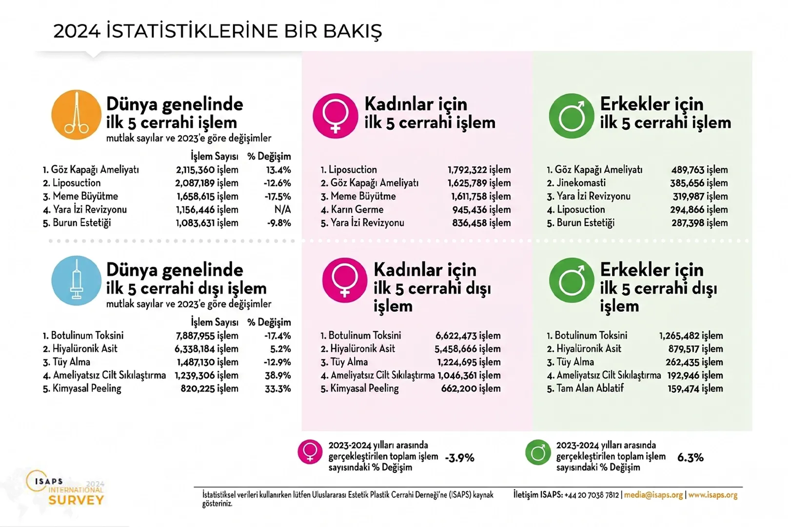 ISAPS’ın 2020 ile 2024 yılları verileri karşılaştırıldığında cerrahi işlemlerde %46,3, cerrahi olmayan işlemlerde ise %39,6’lık artışın bir sebebi, Covid19 salgınından kaynaklanmış olabilir. Bir önceki yıl (2023) ile kıyaslandığında cerrahi işlemlerde %6,7, cerrahi dışı işlemlerde ise %3,1’lik azalma söz konusu.