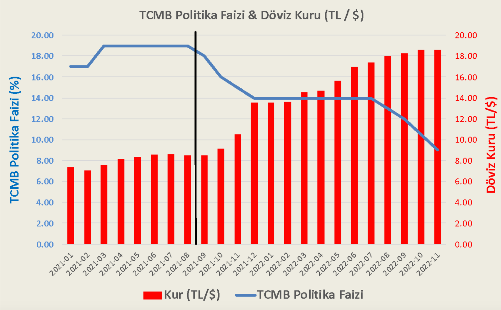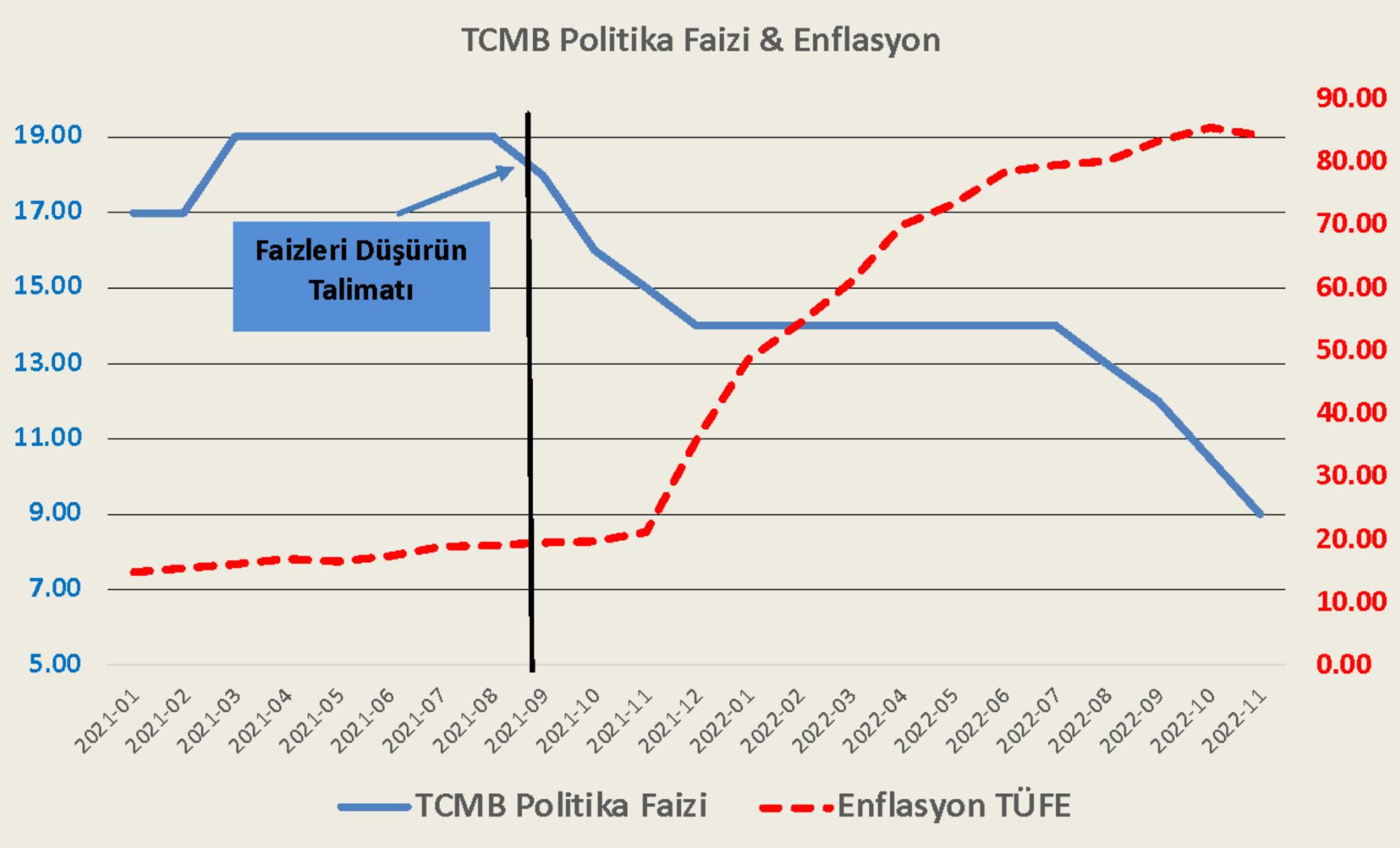 Hatırlayalım; Türkiye 2002’den itibaren iyi kötü bir “düşük enflasyon odaklı para politikası” izlerken, 2021’in Eylül ayında ani bir dönüşle hızlı faiz indirimleri serisine başlamıştı. Hatta piyasalarda yaratacağı ani kriz etkisi dahi göze alınarak TCMB’nin iki başkanı da bu uğurda görevden alındı. Eylül-Aralık 2021 döneminde Cumhurbaşkanı Recep Tayyip Erdoğan’ın keskin çıkışları eşliğinde politika faizleri toplam 500 baz puan indirilerek yüzde 14 seviyesine çekildi. Bu sıra dışı hamlelere piyasanın reaksiyonu doğal olarak kur ve enflasyon artışı olarak gerçekleşti. Eylül 2021’de 8,5 TL olan dolar kuru, 21 Aralık 2021 tarihinde 18,66 TL ile o dönem için rekor seviyeye ulaştı. Eylül’de yıllık yüzde 19,5 düzeyinde bulunan enflasyon oranı ise, Aralık ayına gelindiğinde yüzde 36,1’e varmıştı.