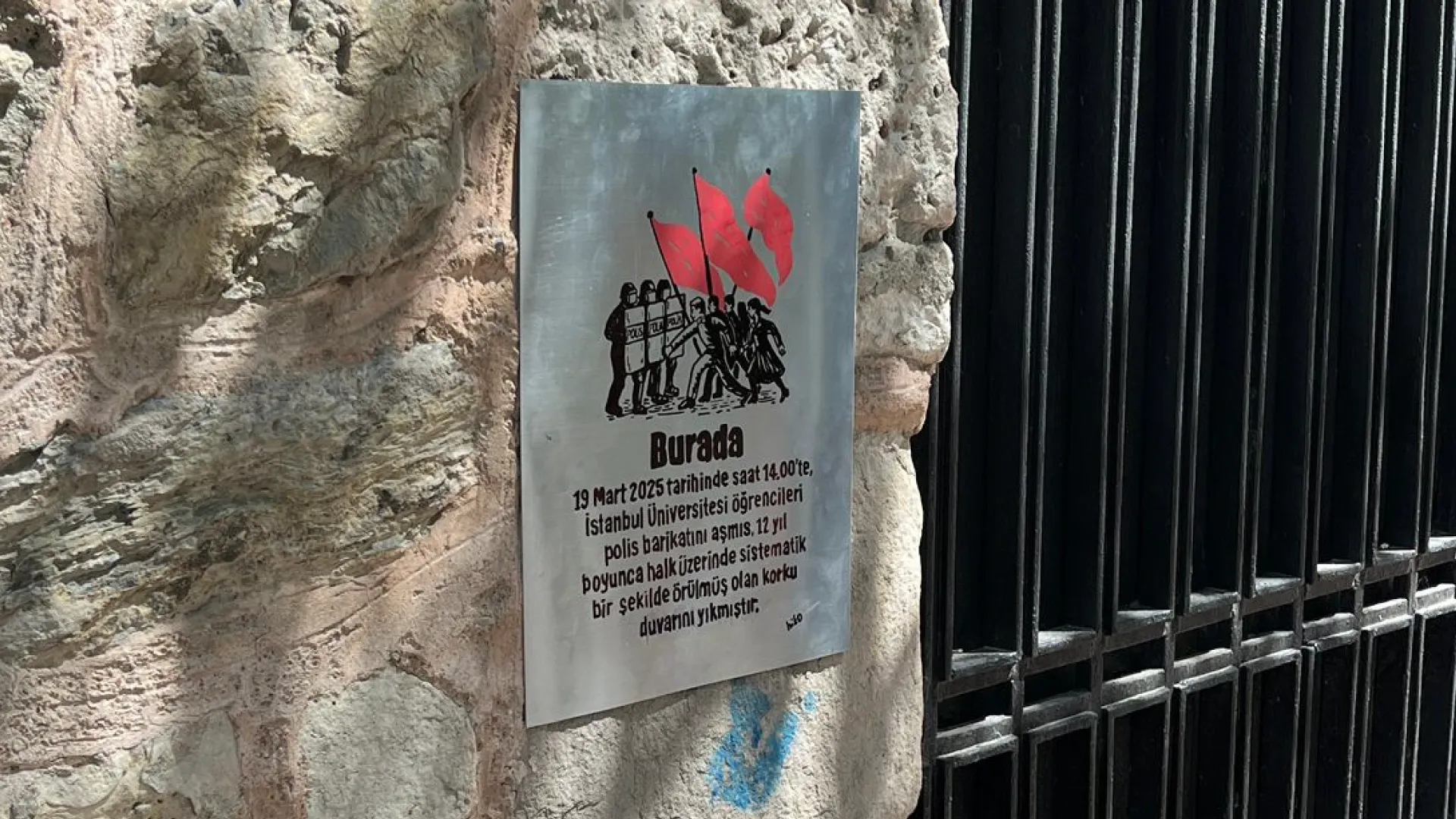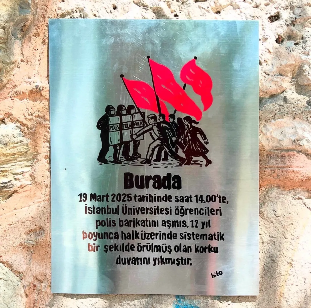 “Burada, 19 Mart 2025 tarihinde saat 14.00’te, İstanbul Üniversitesi öğrencileri polis barikatını aşmış, 12 yıl boyunca halk üzerinde sistematik bir şekilde örülmüş olan korku duvarını yıkmıştır.”