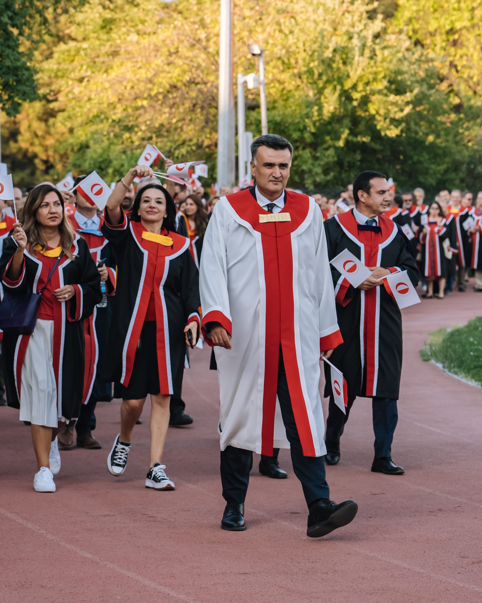 Mezuniyet yürüyüşünde en önde her zaman olduğu gibi akademisyenler ve okul yönetimi yer aldı.