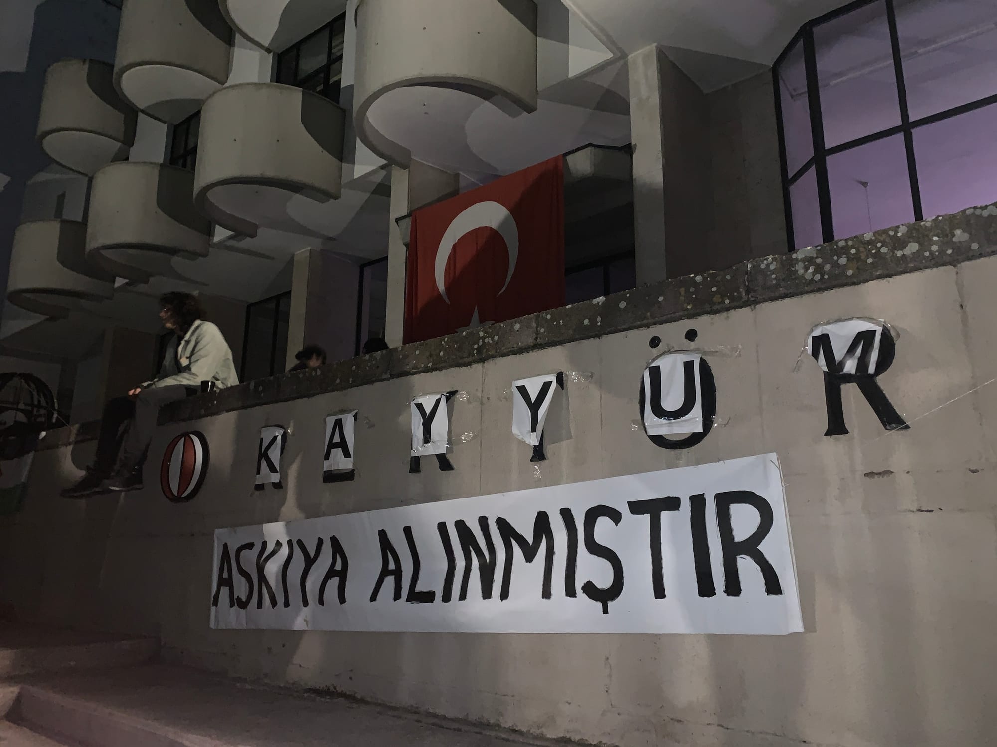 ‘Rektörlük’ yazısını beyaz kağıtlarla ‘Kayyum’ olarak değiştirmişler.