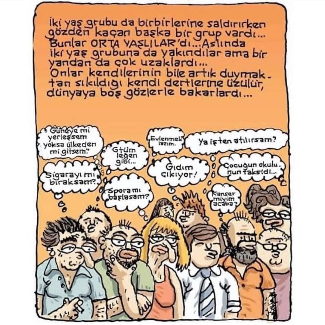 Öyle olunca orta yaşlarını sürenlerin deneyimi, yapısal baskının beklenen bir sonucu olarak, zenginleşme ve olgunlaşma değil, tükenmişlik oluyor. Uzun çalışma saatleri, kronik stres, baskı, hayal kuramama…