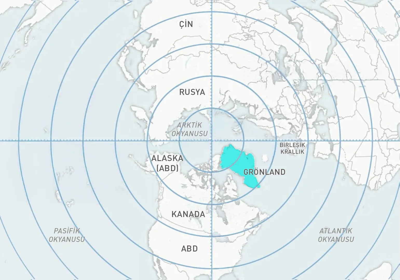 Bakarsanız Çin, Rusya, ABD, Kanada Avrupa’nın etki alanının kesişme noktasında, ortada bir ada göreceksiniz: Grönland